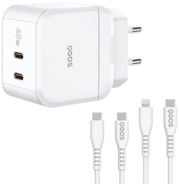 QDOS Bliszteres QDOS POWERCUBE TRIO 45W fehér hálózati töltő USB Type-C és Lightning adatkábellel 3A