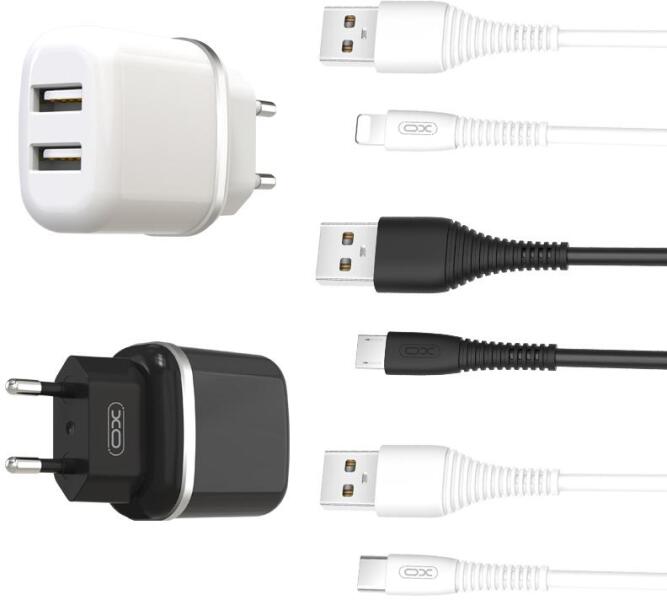 XO L69 2.4A töltő (Fekete) - dupla USB csatlakozó, Lightning kábellel